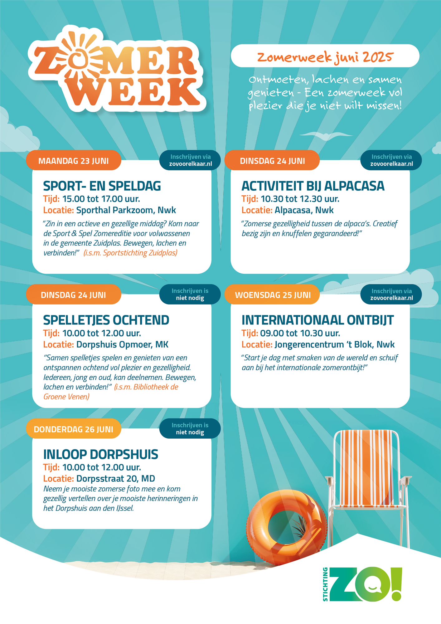 Voor informatie over het hele programma en om je in te schrijven voor de verschillende activiteiten ga je naar Zovoorelkaar.nl/zomerweek. Voor 3 van de 5 activiteiten is een inschrijving nodig. Inschrijven kan tot en met 17 juni maar wees er snel bij want voor sommige activiteiten zijn er maar enkele plekken vrij.