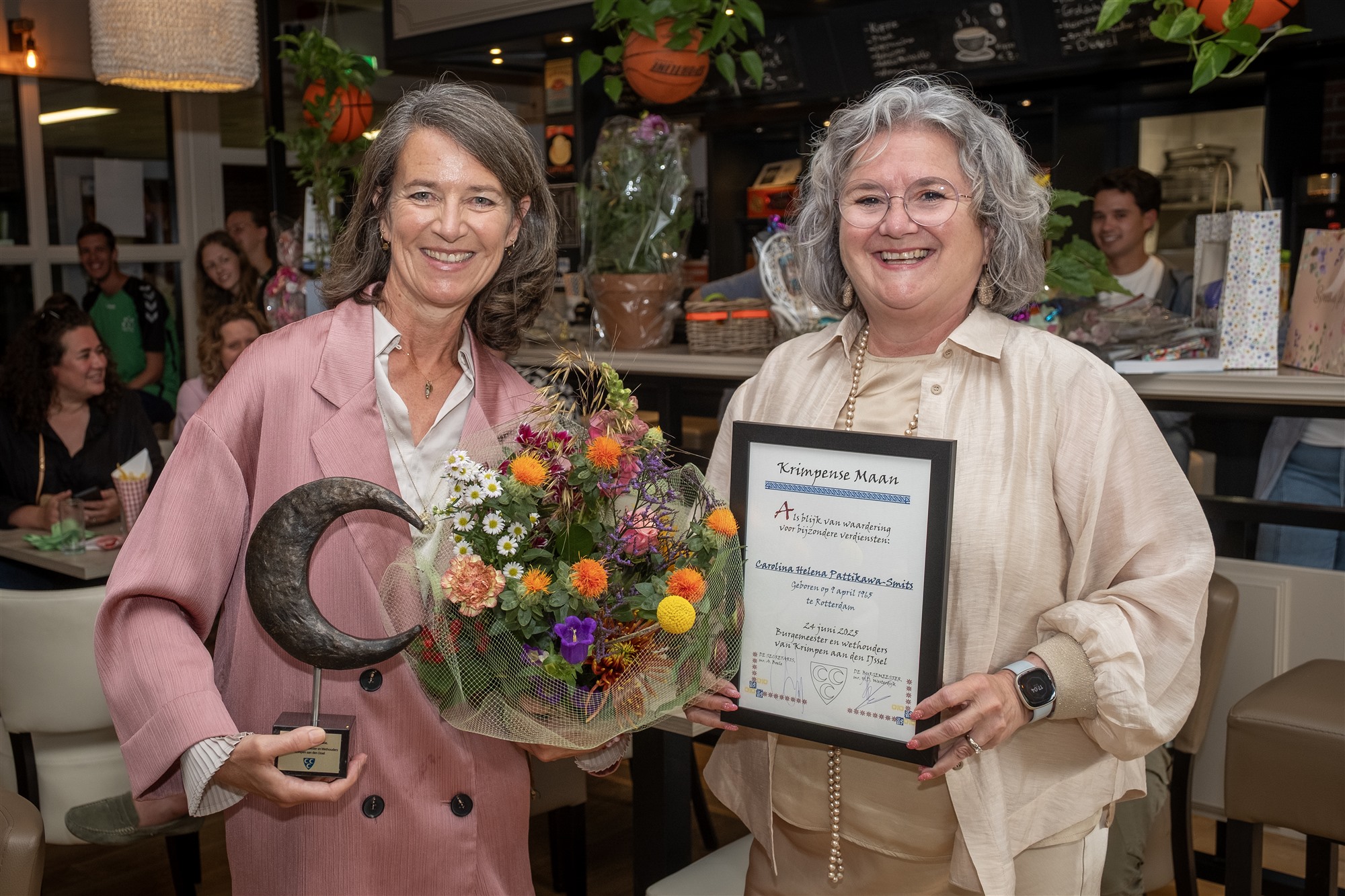 Dinsdag 24 juni werd Karin Pattikawa-Smits verrast met een Krimpense Maan. Wethouder Kirsten Jaarsma overhandigde deze bijzondere onderscheiding als blijk van waardering voor haar jarenlange toewijding en inzet binnen Synerkri. De stichting is de verbindende en actieve kracht op het gebied van sportieve-, culturele- en maatschappelijke activiteiten in Krimpen aan den IJssel.