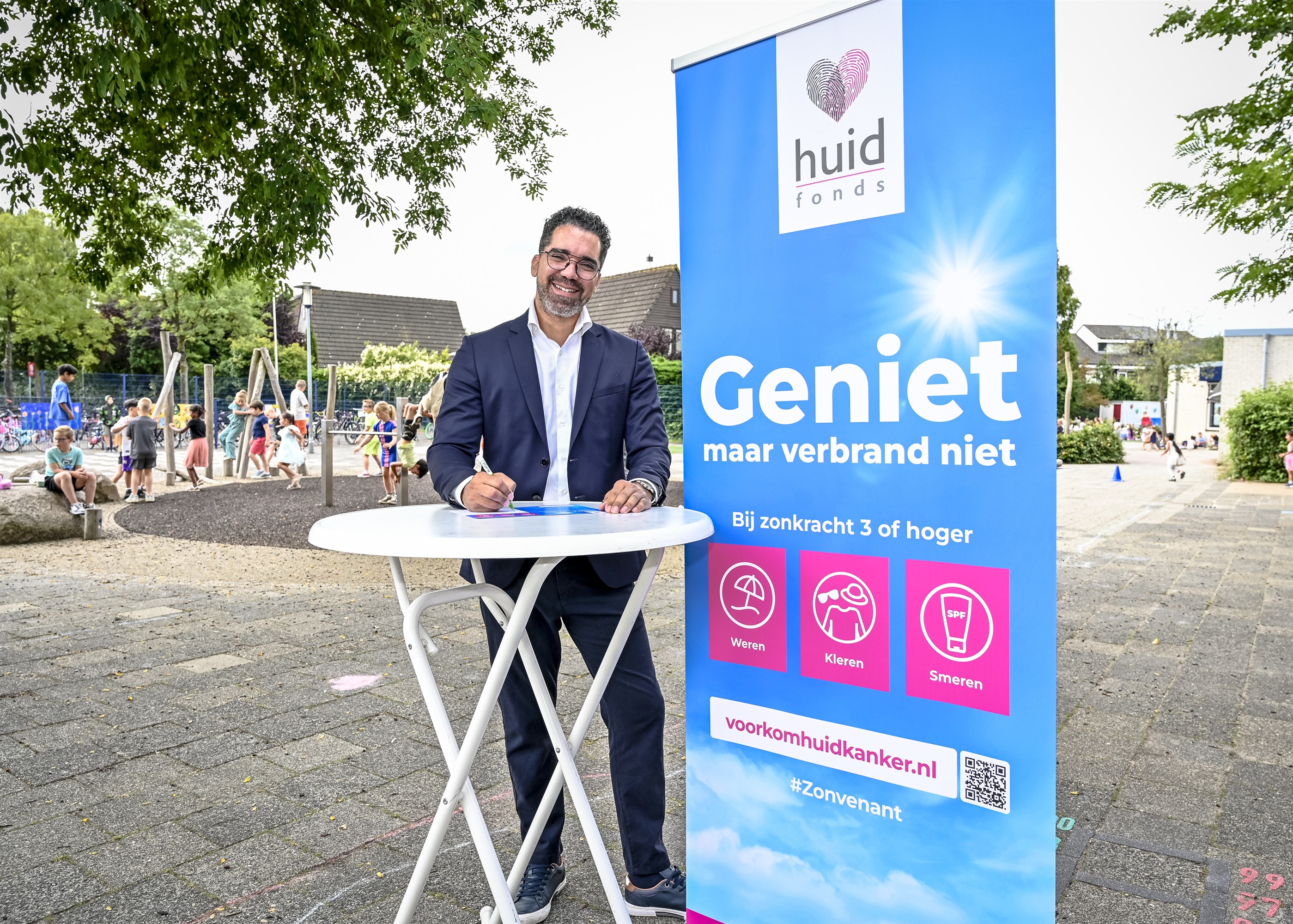 Capelle aan den IJssel, 10 juli 2025 – Op donderdag 10 juli heeft wethouder Gezondheid Marc Wilson samen met leerlingen van basisschool De Contrabas de eerste ‘school’-zonnebranddispenser in gebruik genomen. Er volgen meer dispensers op andere basisscholen in Capelle, zodat kinderen zich altijd kunnen insmeren. Tijdens de bijeenkomst zette wethouder Wilson ook zijn handtekening onder het Zonvenant van het Huidfonds, waarmee de gemeente haar inzet voor een betere zonbescherming onderstreept.