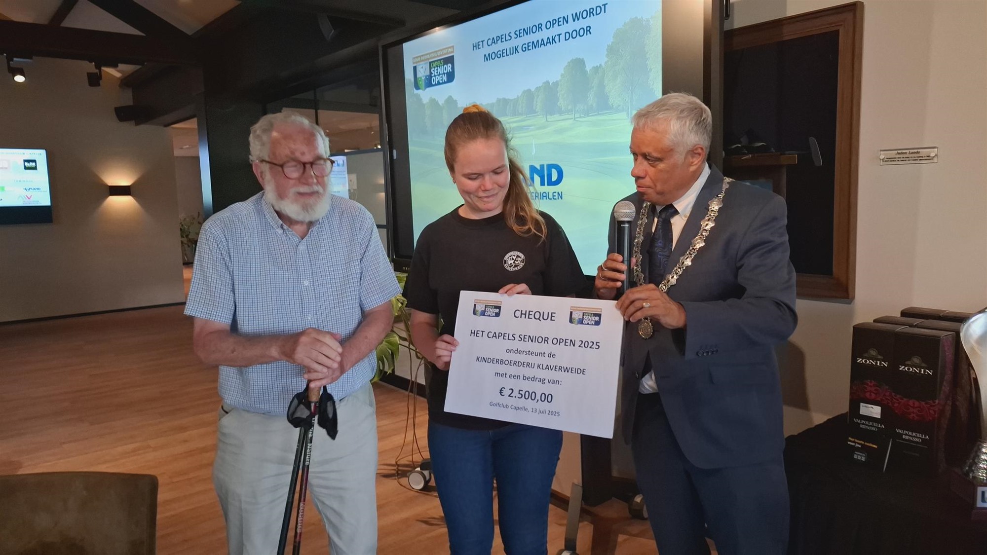 Van vrijdag 11 tot en met zondag 13 juli organiseerde GolfClub Capelle voor de veertiende keer het Capels Senior Open Toernooi. Dit toernooi verenigt niet alleen golfers uit het hele land, maar biedt ook een unieke combinatie van sportiviteit, gezelligheid en betrokkenheid bij de samenleving. Op zondag 13 juli vond de finale van het seniorentoernooi plaats, met als afsluiting de prijs-uitreiking aan de deelnemers door Auke de Boer. Natuurlijk was ook de burgemeester Joost Manusama aanwezig, en het was zijn eer om de felbegeerde wisselbeker aan het winnende team te overhandigen. Bij het Capels Senior Open draaide deze editie ook om meer dan alleen sport. Dit jaar lag de maatschappelijke focus op Kinderboerderij Klaverweide, die haar 50-jarig jubileum vierde. De kinderboerderij is al decennialang een plek van educatieve en recreatieve waarde voor jong en oud in de regio.Ter ondersteuning en als blijk van waardering werd er voor de prijsuitreiking door burgemeester Manusama een cheque van 2500 euro aan kinderboerderij Klaverweide overhandigd.