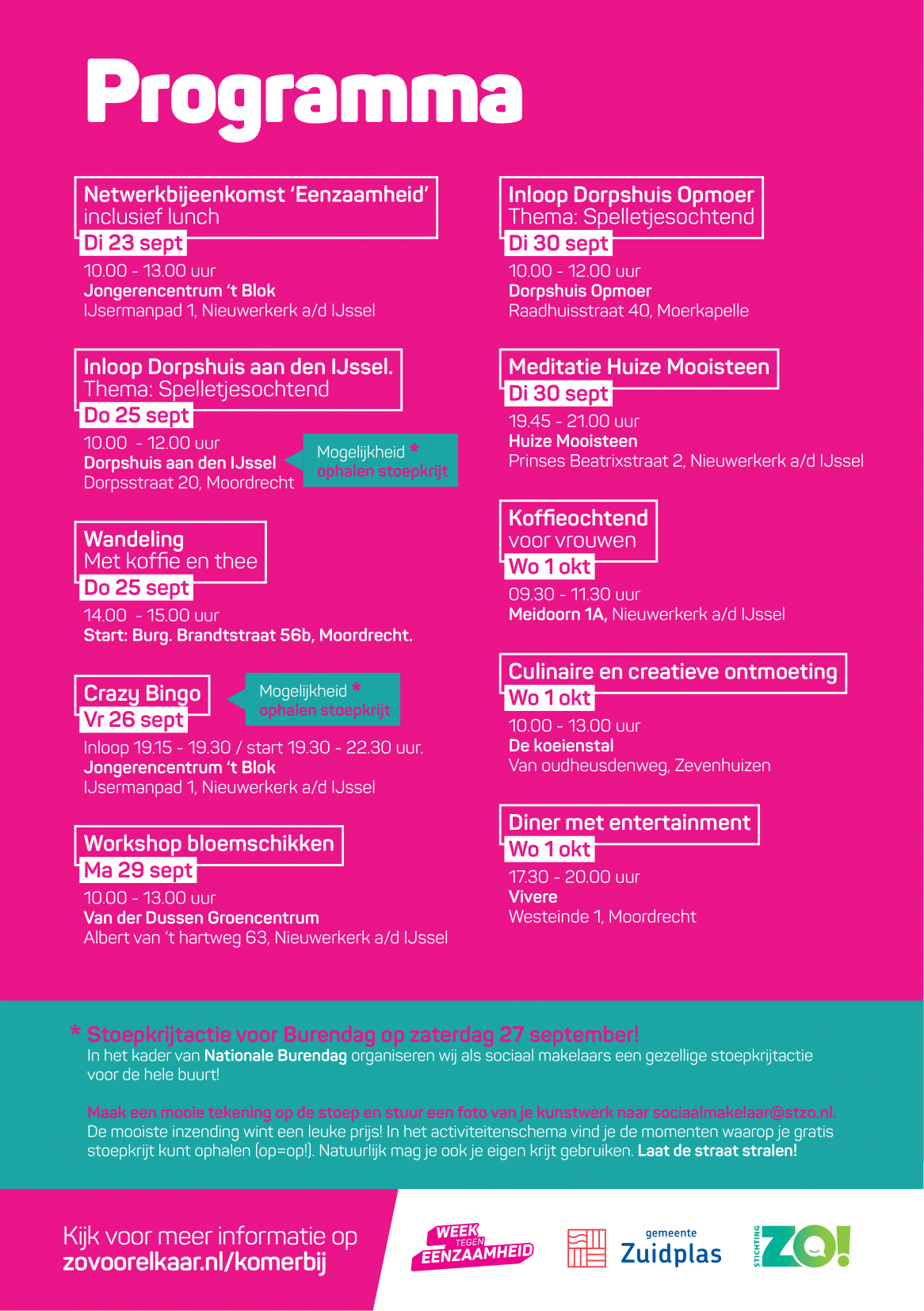 Of je nu jong of oud bent, er is altijd een activiteit die bij jou past. Zo kan je op donderdag 25 september deelnemen aan een wandeling. Of doe op vrijdag 26 september mee met de Crazy Bingo waar leuke prijzen te winnen zijn. Op woensdag 1 oktober kan je aanschuiven bij een heerlijk diner met entertainment. Dit zijn slechts drie van de in totaal 10 activiteiten. Voor meer informatie over het hele programma en om je in te schrijven voor de verschillende activiteiten ga je naar zovoorelkaar.nl/komerbij. Inschrijven kan tot en met 15 september maar wees er snel bij want voor sommige activiteiten zijn er maar enkele plekken vrij. Let op, niet voor alle activiteiten is een inschrijving nodig. Mail sociaalmakelaar@stzo.nl voor vragen.