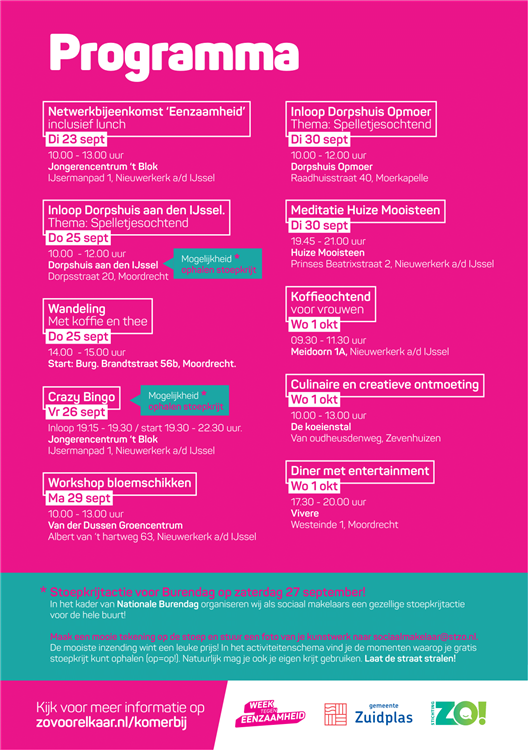 Ook dit jaar organiseren de Sociaal makelaars van Stichting ZO! de Kom Erbij Week. In alle dorpen van Zuidplas zijn van 25 september tot en met 1 oktober leuke, gratis activiteiten. Inwoners kunnen bijvoorbeeld meedoen aan een spelletjesochtend of een les meditatie. Het is een mooie kans om nieuwe mensen te ontmoeten. Alle activiteiten zijn gratis en iedereen is welkom. Aanmelden kan via zovoorelkaar.nl/komerbij.