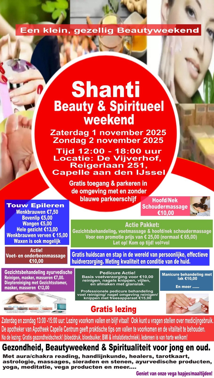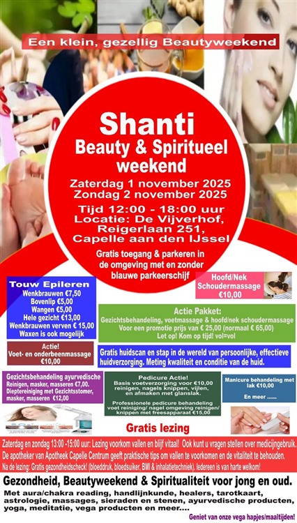 Op zaterdag 1 en zondag 2 november wordt de Plaza van woonzorgcentrum De Vijverhof in Capelle aan den IJssel omgetoverd tot een oase van rust en inspiratie tijdens het Shanti Beauty & Spiritueel Weekend. Dit tweedaagse evenement, dat gehouden wordt van 12:00 tot 18:00 uur, biedt een gevarieerd en zorgvuldig samengesteld programma dat gericht is op het verrijken van zowel lichaam als geest. Het Shanti Beauty & Spiritueel Weekend is de perfecte gelegenheid om jezelf onder te dompelen in een rustige en stimulerende omgeving waar persoonlijke groei, ontspanning en inspiratie centraal staan. Je kunt rekenen op waardevolle inzichten, boeiende activiteiten en een warme, harmonieuze sfeer. Of je nu behoefte hebt aan een moment van stilte of juist op zoek bent naar nieuwe energie, dit evenement biedt een unieke ervaring die niet alleen plezier brengt, maar ook een blijvende positieve invloed kan hebben op je welzijn. Grijp deze kans om te werken aan je innerlijke balans en vitaliteit!