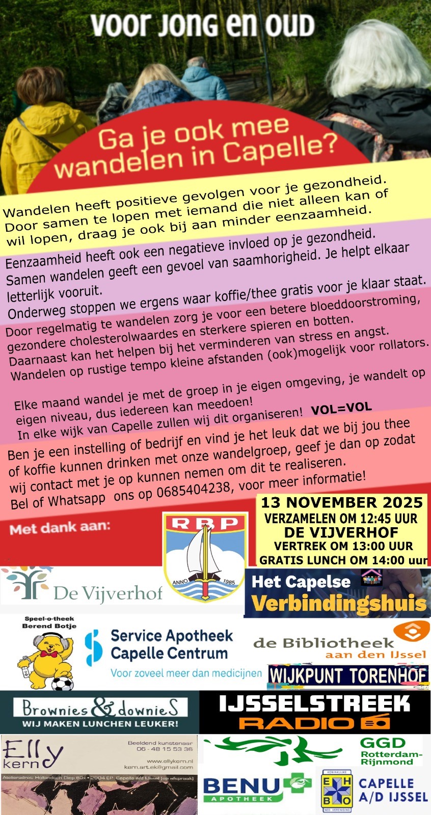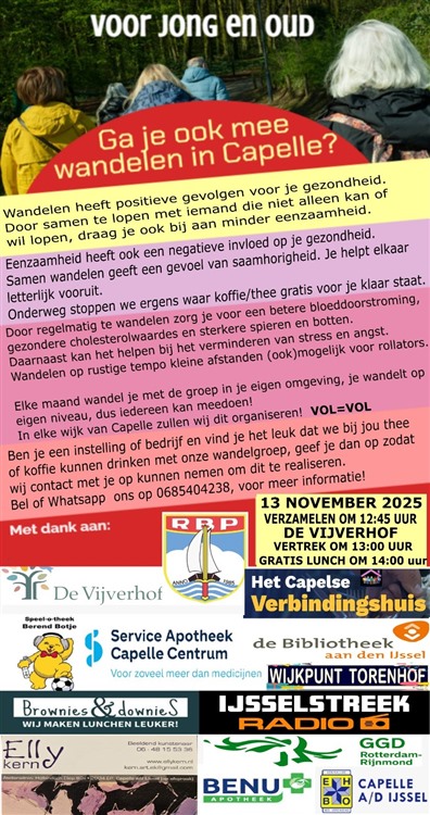 Op donderdagmiddag 13 november organiseert het Capelse Verbindingshuis weer een wandeling door een van de wijken in Capelle.Tijdens deze activiteit kunnen deelnemers samen genieten van een ontspannen wandeling in de buitenlucht. De wandeling biedt niet alleen een uitstekende gelegenheid om actief bezig te zijn, maar dient ook als een mooi moment om sociale contacten te versterken en nieuwe gezichten in de gemeenschap te leren kennen. Met deze activiteiten wil het Capelse Verbindingshuis een gevoel van saamhorigheid en verbinding bevorderen, terwijl het tegelijkertijd een actieve leefstijl stimuleert. Net als bij de eerste wandeling is de Plaza van woonzorgcentrum De Vijverhof het verzamelpunt. Vanaf 12:45 uur bent u daar van harte welkom en wordt u ontvangen met een kop koffie of thee. De wandeling start om 13:00 uur en eindigt om 14:00 uur. Na afloop kunt u genieten van een gratis lunch die voor u wordt aangeboden.
