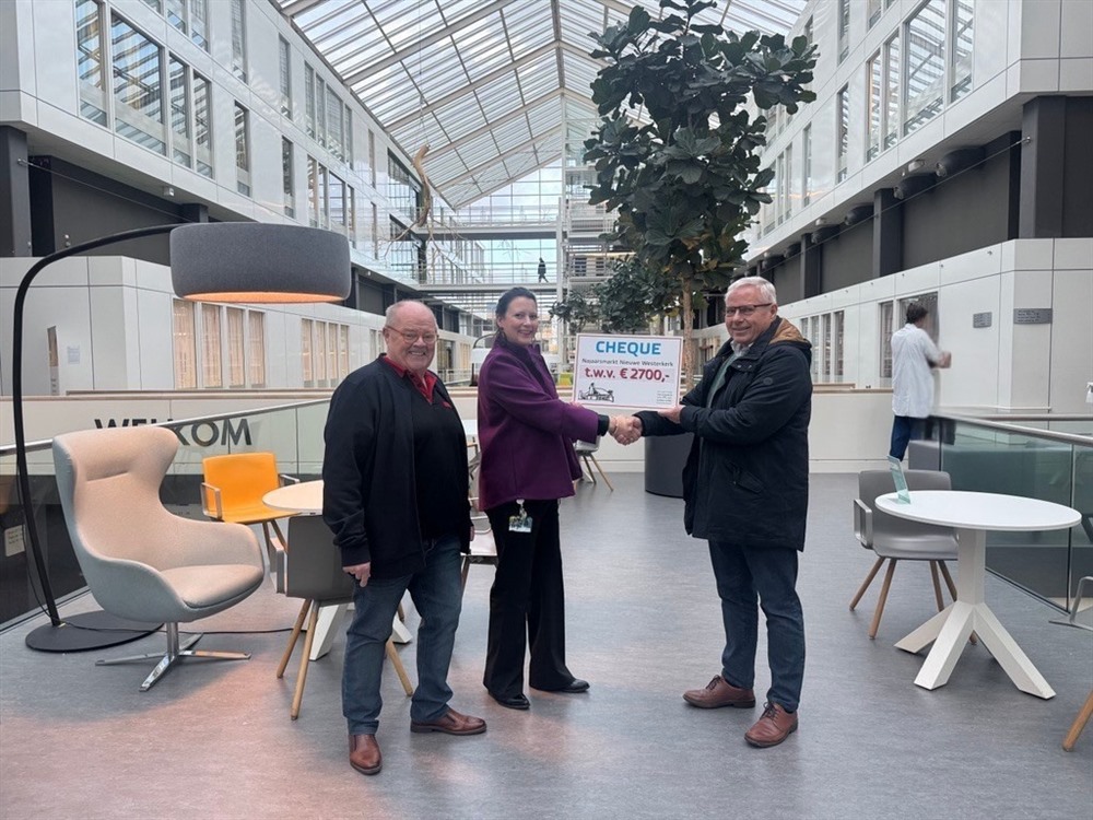 De cheque werd in het ziekenhuis overhandigd door Tiemen Schouten en Willem Molenaar aan Chantal Kalmeijer, fondsenwerver van het IJsselland Ziekenhuis.