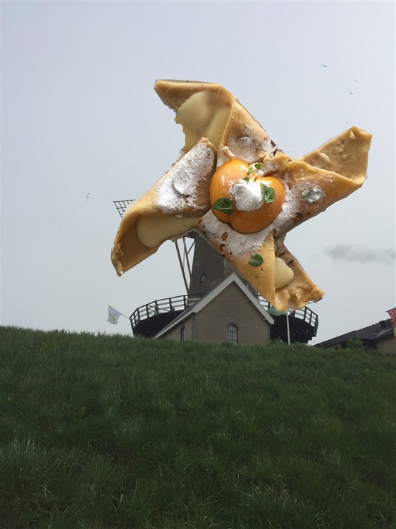 Bakken doen we op de begane grond in de korenmolen waar ook 2 statafels staan. Is het terras weer dan zijn daar zitplaatsen. Natuurlijk is het beslag van zelfgemalen meel en gebuild bloem. “Er is stroop, poedersuiker maar bovenal de zéér bijzondere wieken-pannenkoek.” Laat Dick Groenendal, gastheer van het eerste uur, weten.