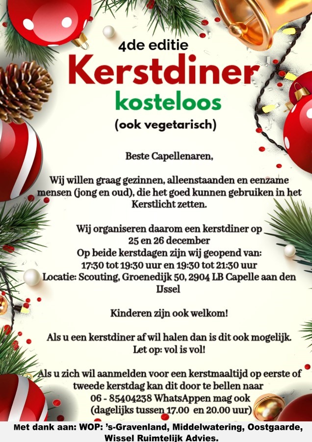 Op eerste en tweede kerstdag organiseert het Capelse Verbindingshuis voor de vierde keer een kerstdiner voor gezinnen, eenzame mensen en iedereen die behoefte heeft aan een warm samenzijn. Beide avonden bent u welkom van 17:30 tot 21:30 op de locatie van de Scouting aan de Groenendijk 50, 2904 LB in Capelle aan den IJssel. Uiteraard zijn kinderen ook van harte welkom, en bestaat de mogelijkheid om een kerstdiner af te halen.