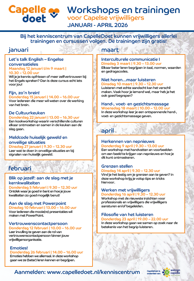 CAPELLEAANDENIJSSEL. De nieuwe trainingskalender van het kenniscentrum van CapelleDoet is weer uit! Er staan weer allerlei leuke, nuttige en boeiende (gratis) trainingen op het programma in 2026. Vertrouwde trainingen als ‘Interculturele communicatie’ en ‘Niet horen…maar luisteren’ hebben we uiteraard in het programma opgenomen. Daarnaast komen er ook nieuwe trainingen en workshops aan zoals ‘Hand-, voet- en gezichtsmassage’, ‘Fijn, zo’n brein!’ en ‘Aan de slag met PowerPoint’.