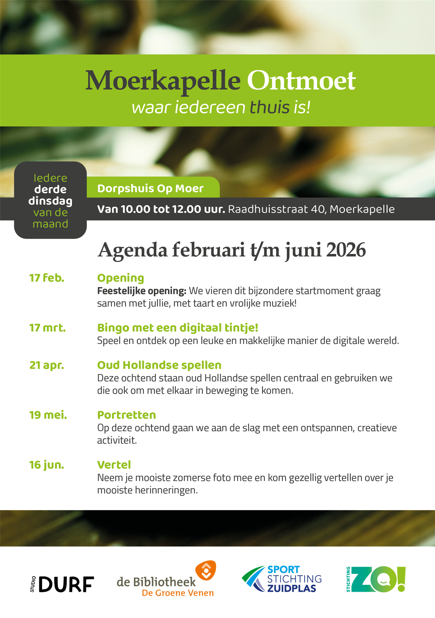 Moerkapelle Ontmoet is een initiatief van de Sociaal makelaars van Stichting ZO!, de Sportstichting Zuidplas, de Cultuuraanjager en de Bibliotheek De Groene Venen.