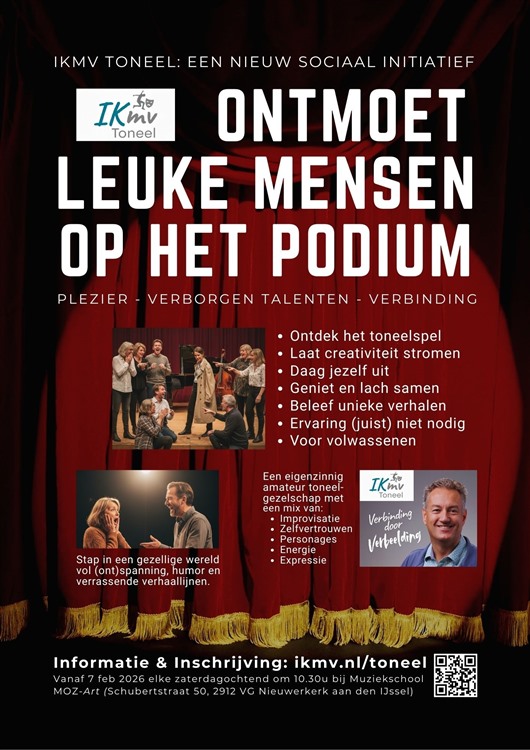 NIEUWERKERK AAN DEN IJSSEL – Vanaf zaterdag 7 februari krijgt de gemeente Zuidplas een bijzondere culturele impuls. Onder de vlag van de community ‘Iedereen Krijgt meer vrienden’ (IKmv) start IKmv Toneel in de aula van Muziekschool MOZ-Art. Dit nieuwe initiatief nodigt volwassenen uit om de magie van het podium te ontdekken in een open, vertrouwde omgeving waar plezier en verbinding centraal staan.