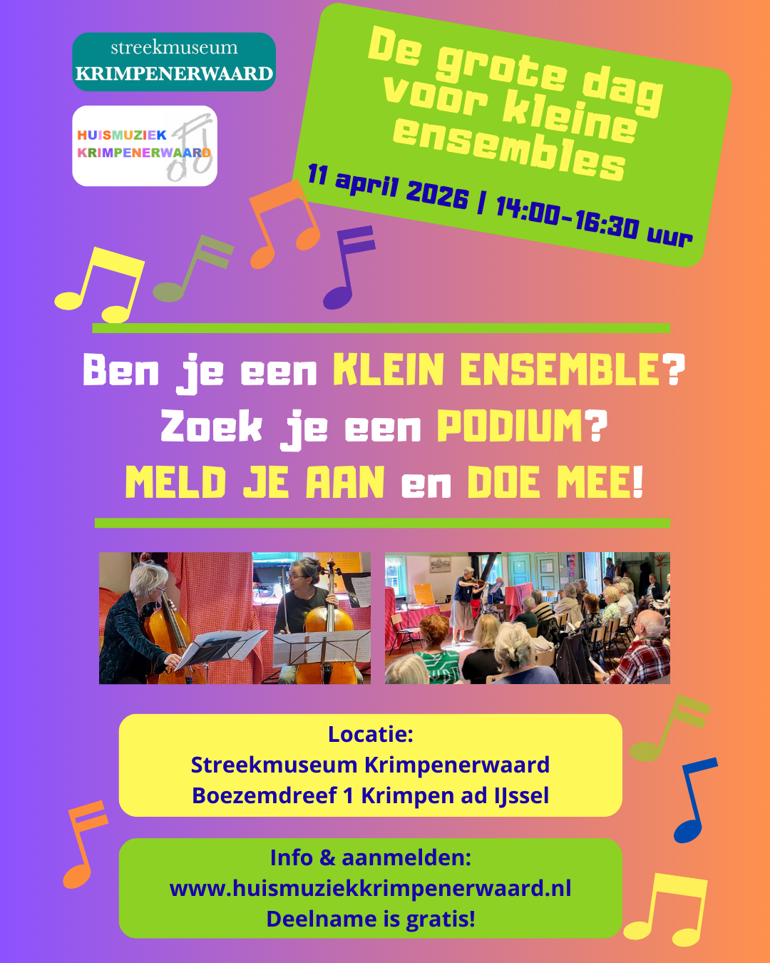 Ben je een klein ensemble van twee tot maximaal tien personen? Speel je regelmatig met andere muzikanten in je huiskamer? Wil je graag optreden voor publiek? Meld je dan aan voor De grote dag voor kleine ensembles op zaterdagmiddag 11 april van 14 tot 16:30 uur in het Streekmuseum in Krimpen aan den IJssel. Meedoen is gratis. Aanmelden kan tot 1 april.