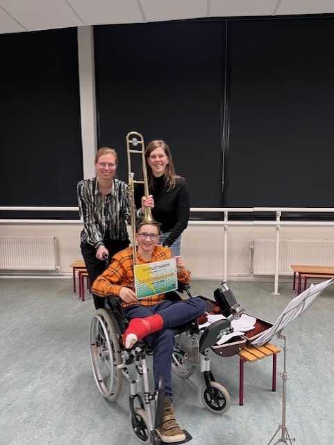 Foto (van links naar rechts): Wendy Barten (muziekdocent bij MOZ-Art), Marlies Koffeman (projectleider vanuit Cultuureducatiegroep) Joris (winnaar)