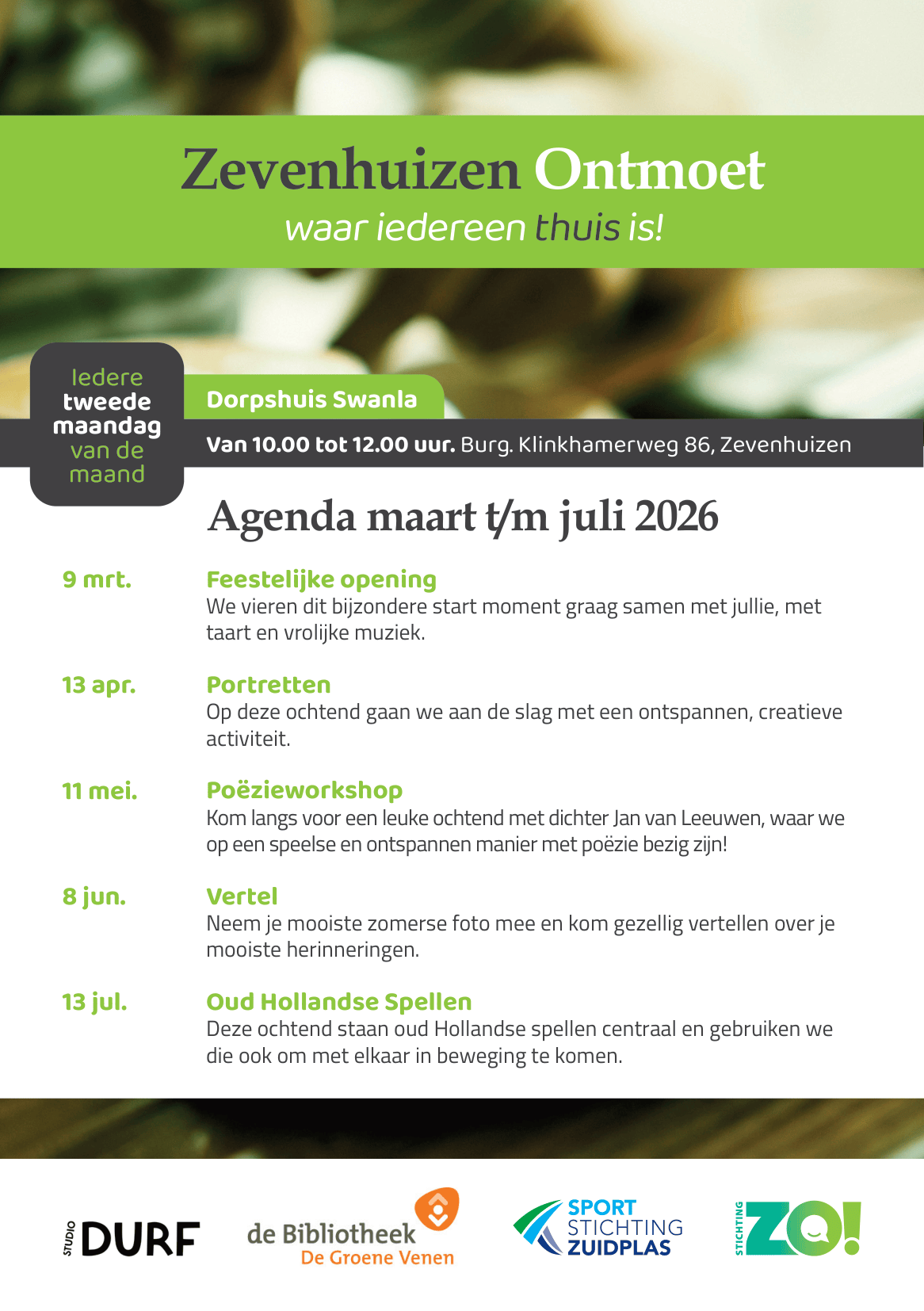De eerste bijeenkomst is op maandag 9 maart om 10.00 uur bij dorpshuis Swanla, Burgemeester Klinkhamerweg 86. Dit moment staat in het teken van de feestelijke opening. Iedereen is van harte welkom om dit samen te vieren. Er is koffie en thee, iets lekkers en alle gelegenheid om kennis te maken en de sfeer te proeven.