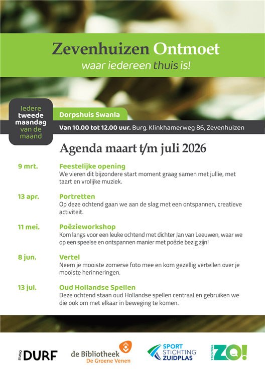 Zevenhuizen Ontmoet is een initiatief van de Sociaal makelaars van Stichting ZO!, de Sportstichting Zuidplas, de Cultuuraanjager en de Bibliotheek De Groene Venen.