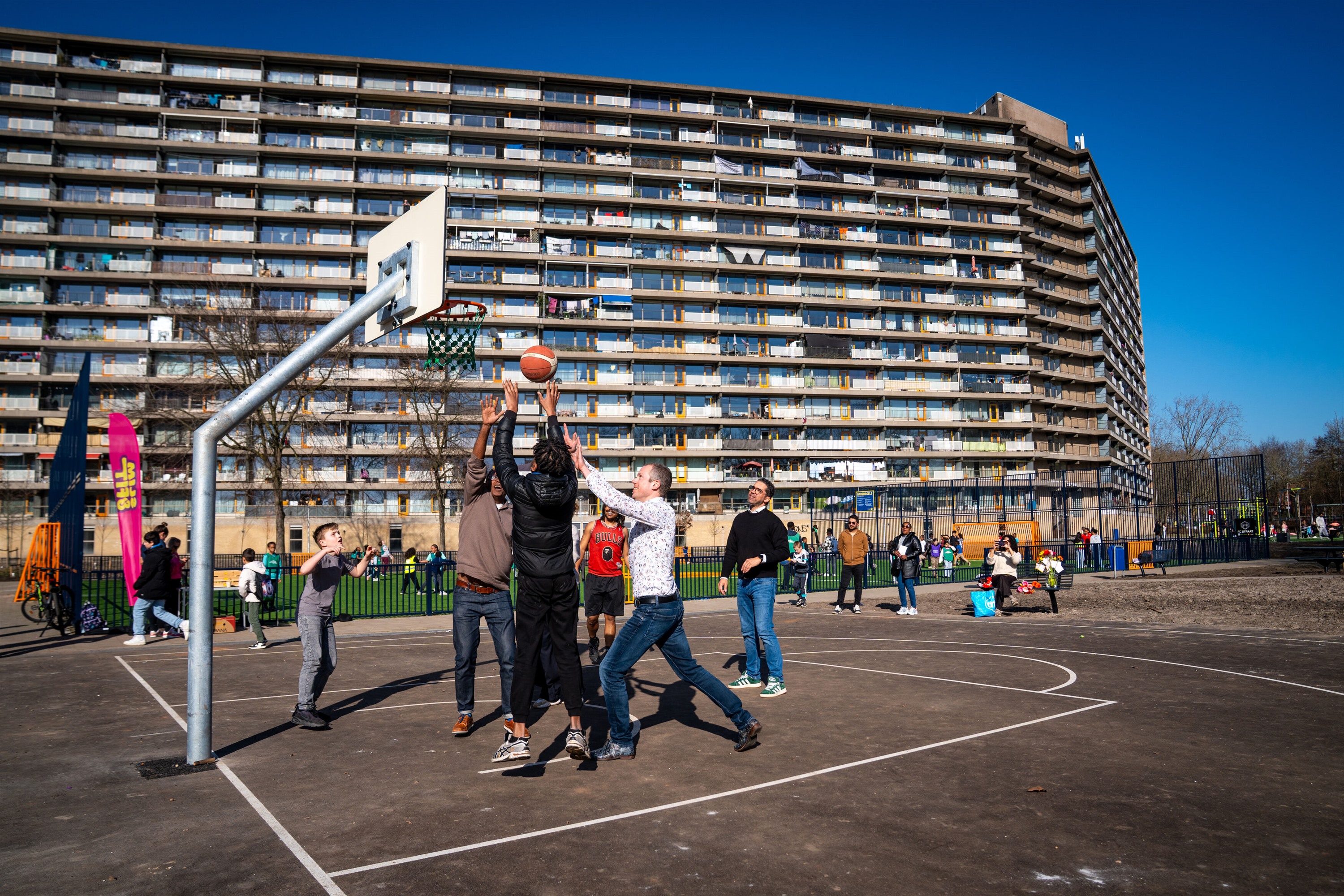 Tijdens het feestelijke moment speelden wethouders Geissler (Wonen) en Wilson (Buitenruimte) samen met kinderburgemeester Thijs een potje basketbal. Zo gaven zij het officiële startsein voor het gebruik van de nieuwe buitenruimte.