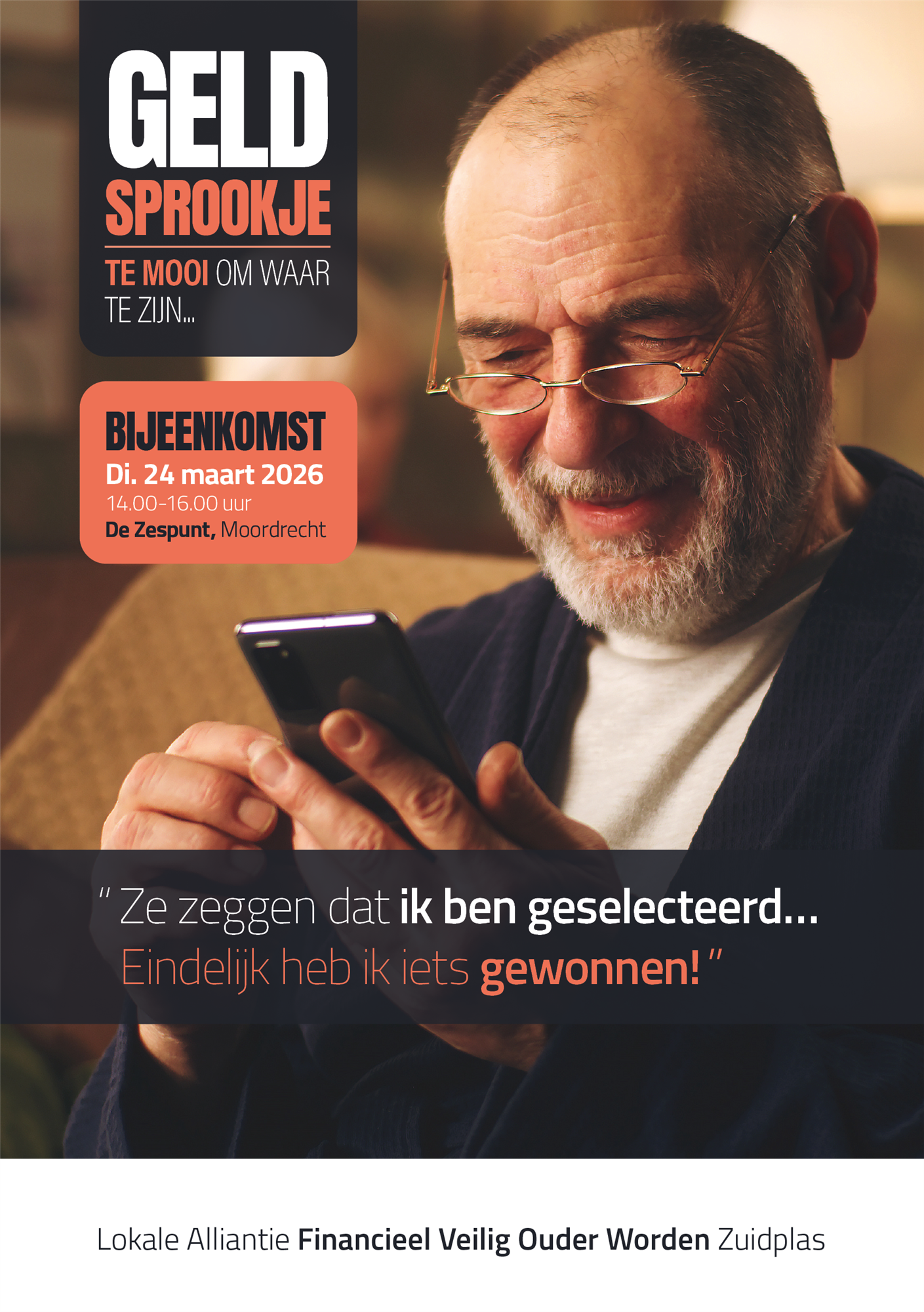 De middag wordt georganiseerd door Stichting ZO! in samenwerking met de lokale alliantie Financieel Veilig Ouder Worden Zuidplas. Alle senioren en andere geïnteresseerden zijn welkom om op een leerzame en leuke manier te ontdekken hoe zij hun geld veilig kunnen houden en hoe ze fraude kunnen herkennen. De bijeenkomst is van 14.00 tot 16.00 uur in De Zespunt, Molenlaan 1a in Moordrecht.