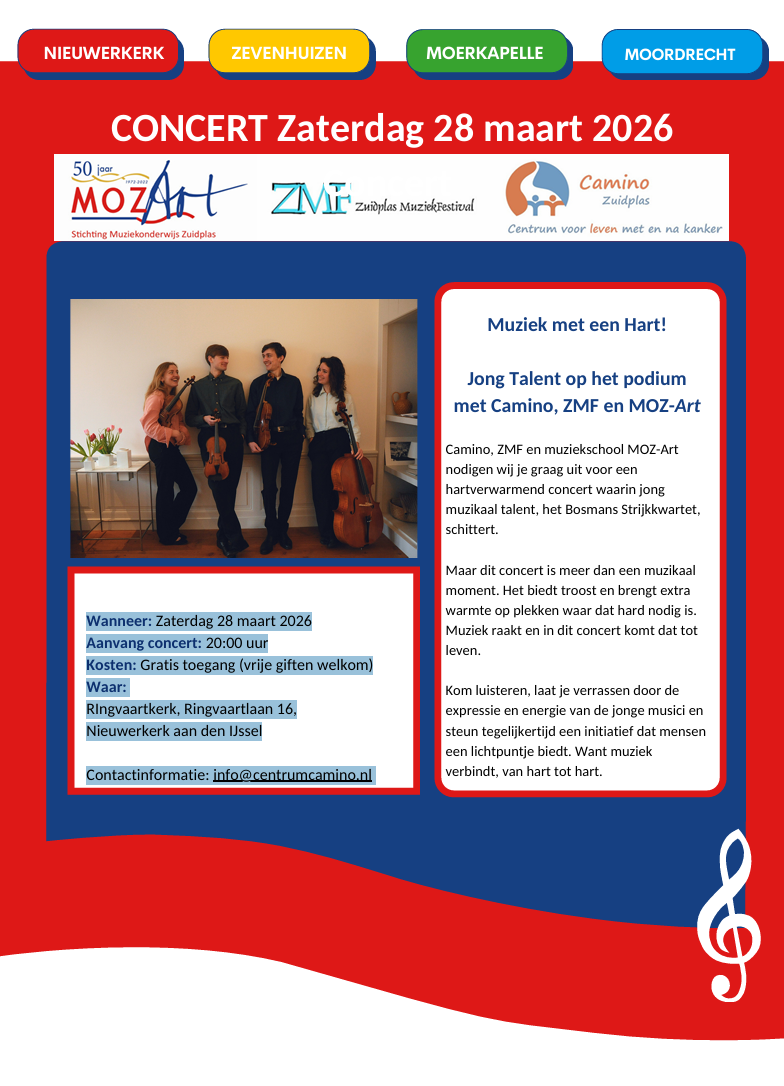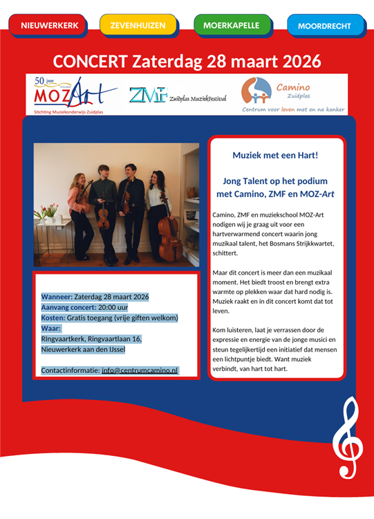 Camino, ZMF en muziekschool MOZ-Art nodigen wij je graag uit voor een hartverwarmend concert waarin jong muzikaal talent, het Bosmans Strijkkwartet, schittert. Maar dit concert is meer dan een muzikaal moment. Het biedt troost en brengt extra warmte op plekken waar dat hard nodig is.Kom luisteren, laat je verrassen door de expressie en energie van de jonge musici en steun tegelijkertijd een initiatief dat mensen een lichtpuntje biedt. Want muziek verbindt, van hart tot hart.