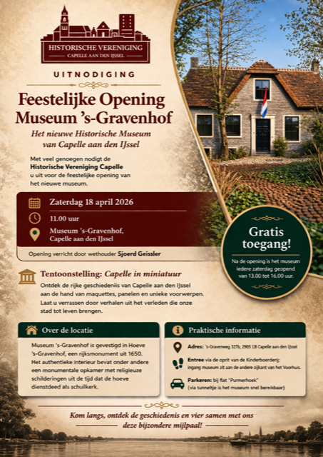 Op zaterdag 18 april 2026 opent de Historische Vereniging Capelle aan den IJssel haar nieuwe onderkomen in het Museum ’s-Gravenhof, het monumentale Voorhuis van de Kinderboerderij aan de ’s-Gravenweg 327; 2905 LB Capelle aan den IJssel.