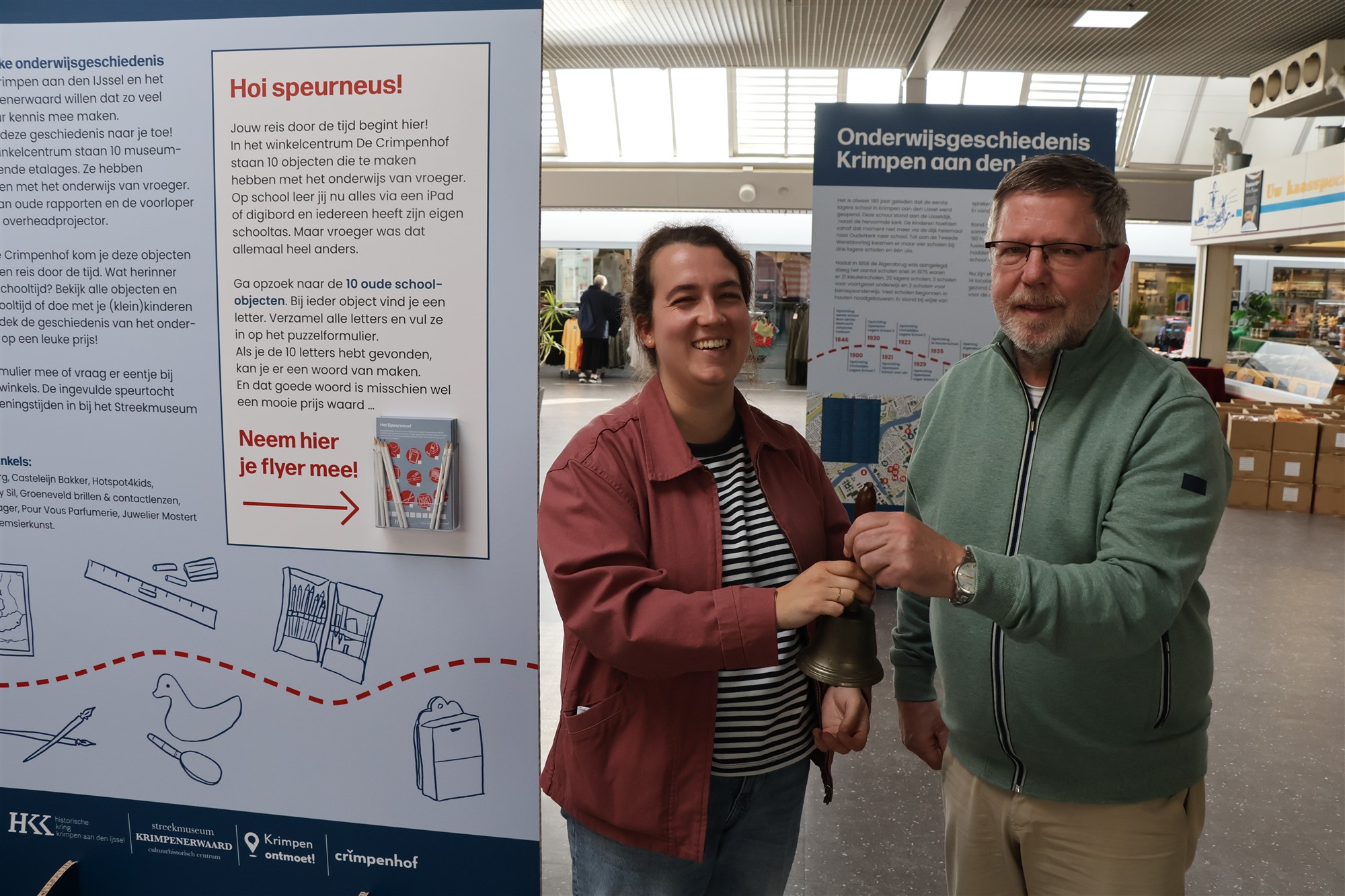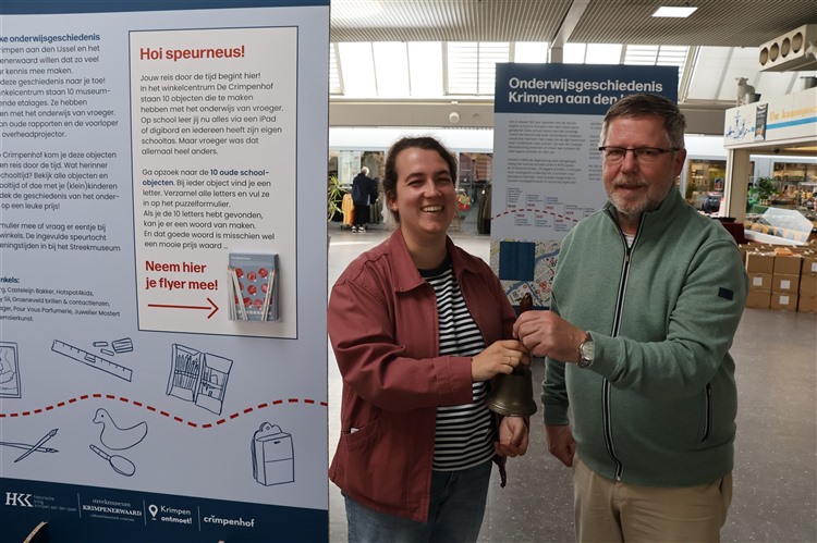 De pop-up tentoonstelling werd vrijdag met het luiden van de oude schoolbel geopend door Henk Heurter van de HKK en Maud Brouwers van het Streekmuseum. Interim-directeur van het museum, Frank Druijff, legt uit dat de tentoonstelling onderdeel is van het project ‘Krimpen terug in de Schoolbank. “Dit is de eerste van vier activiteiten over onze onderwijsgeschiedenis voor Krimpenaren van alle leeftijden. Met deze pop-up tentoonstelling treden we naar buiten en brengen we het verleden naar mensen toe.”