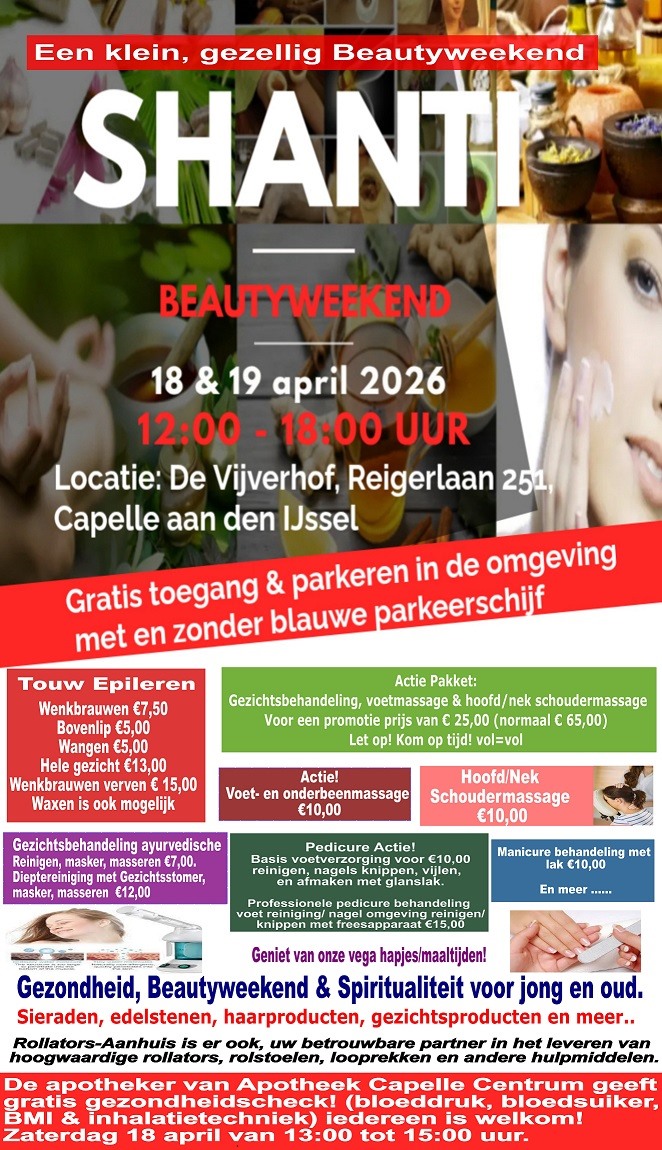 Op zaterdag 18 en zondag 19 april vindt in de plaza van woonzorgcentrum de Vijverhof het Shanti Beauty-weekend, plaats Bezoekers zijn beide dagen van harte welkom tussen 12:00 en 18:00 uur om te genieten van een combinatie van gezondheid,spiritualiteit en schoonheid. Het evenement biedt een gelegenheid om helemaal tot rust te komen en inspiratie op te doen,met aandacht voor zowel innerlijk als uiterlijk welzijn in een ontspannen sfeer. Daarnaast zijn er diverse vegetarische hapjes en maaltijden verkrijgbaar, staat Rollators Aan Huis klaar met alle advies over rollators, rolstoelen, looprekken en andere hulpmiddelen. En op zaterdag 18 april tussen 13:00 en 15:00 uur, is de apotheker van Apotheek Capelle Centrum aanwezig voor een gratis gezondheidscheck, waar bezoekers hun bloeddruk, bloedsuiker en BMI kunnen laten meten evenals hun inhalatietechniek laten controleren.