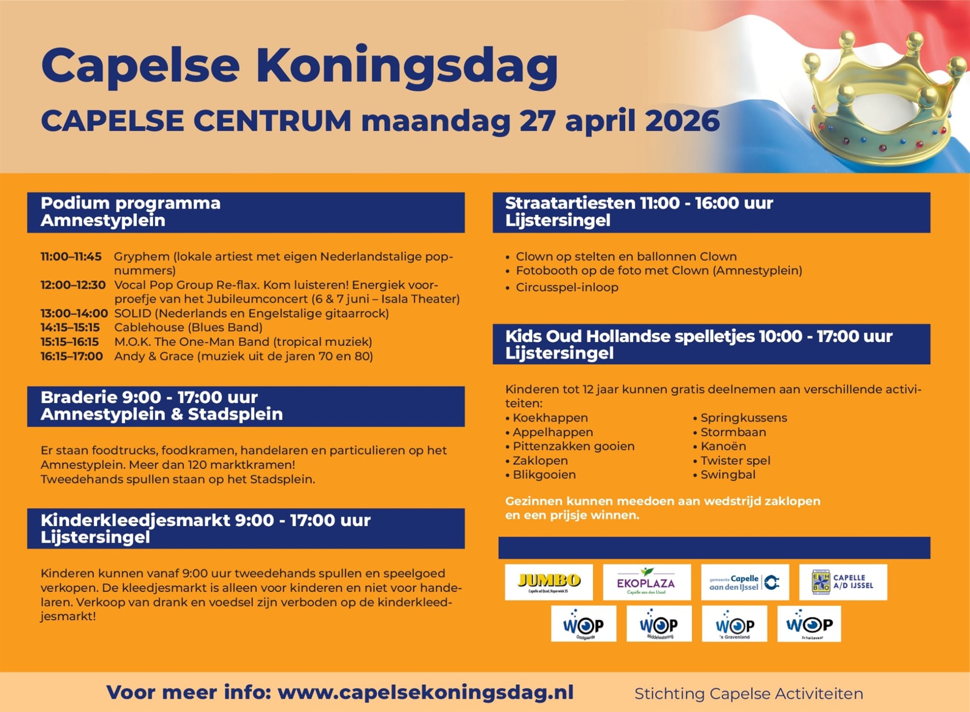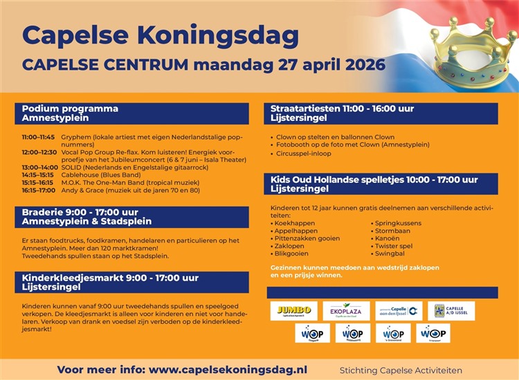 Op maandag 27 april kleurt Capelle aan den IJssel weer oranje tijdens de viering van Koningsdag.Stichting Capelse Activiteiten heeft een fantastisch programma samengesteld om er weer een onvergetelijke feestdag van te maken. Het centrum van Capelle bruist van de activiteiten, met volop vermaak voor jong en oud.